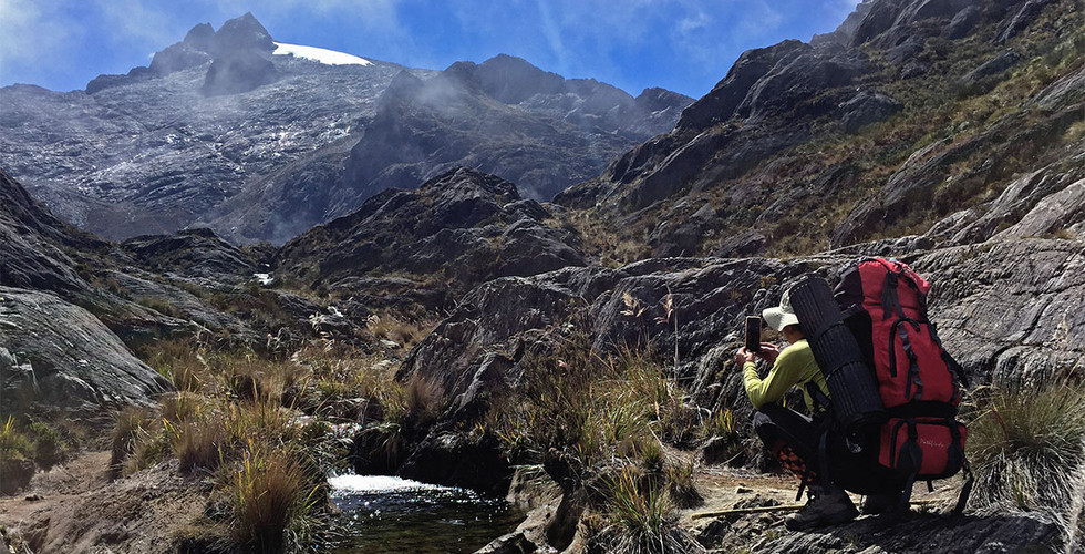 Día 2: luego de un sustancioso desayuno, caminamos por el grandioso páramo andino, aquí ya se va perfilando la alta montaña con sus puntiagudas cumbres. Las mulas y arrieros nos acompañan hasta el Alto del Arenero, donde cargamos nuestras mochilas para bajar hasta el desagüe de la laguna Verde, que si está despejado hay una vista de postal del pico Humboldt.